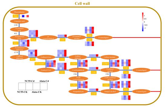 图1 NC55和花烟草木质素合成通路基因在正常处理和镉胁迫下的表达。