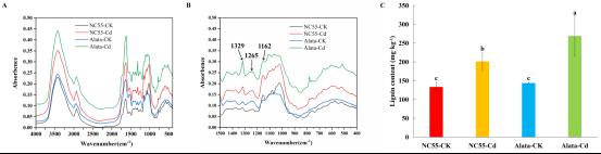 图2 正常处理和镉胁迫下NC55和花烟草中木质素含量差异。