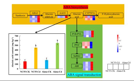 镉是重要的环境污染物,由于自然因素和人为活动,导致土壤镉污染日益加剧。镉通过诱导氧化应激,抑制光合作用,扰乱激素稳态,破坏离子平衡等方式对植物生长发育造成不利影响。烟草是重要的经济作物,叶片中能够积累高浓度的镉,且易于收获,是良好的土壤镉污染修复植物。与普通烟草(Nicotiana tabacum)相比,花烟草(Nicotiana alata)具有更强的镉积累和耐受能力,更适合作为镉污染土壤的植物修复材料。相关研究成果“Abscisic acid-mediated lignin biosynthesis and cell wall reinforcement confer cadmium tolerance in Nicotiana alata”在中科院一区Top期刊《Industrial Crops and Products》(影响因子6.2)上发表。 该研究发现与NC55相比,镉胁迫下花烟草根系木质素合成基因PAL,HCT,CCR,COMT,CAD,POD和LAC基因的表达量显著提高,促进了木质素合成,增强细胞壁对镉的固定作用,从而减轻镉对细胞的毒害。同时,镉胁迫激活了花烟草ABA合成和信号转导,进一步提高花烟草对镉的耐受能力。