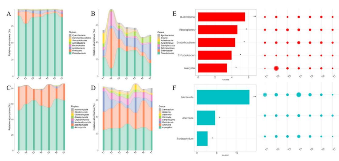 图1 细菌、真菌在门/属水平的群落分布与核心微生物标志物